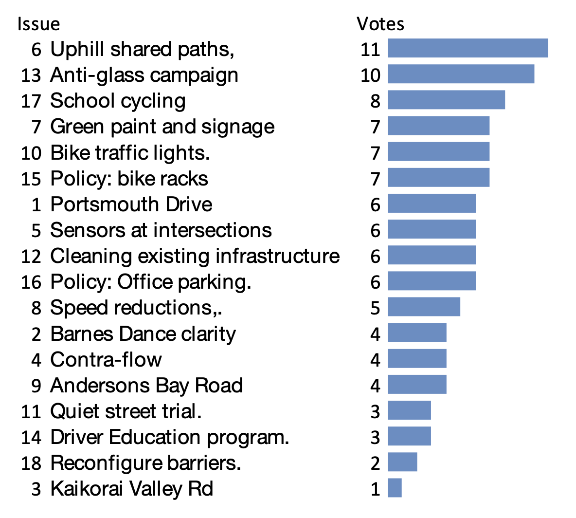 Yes, but on the other hand we don’t have to use a vote as the only decider, and it would give us the ability to say to council “this was identified as important by bike breakfast participants” Have we got the capacity to do ranked order voting?